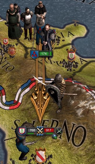 Oh cazzo. Il sultano Tomim I Zirid è sbarcato a Salerno con ingenti truppe. Ha avuto culo con le condizioni meteo. Su Cinguettio la propaganda islamica del suo regime sta già mettendo i primi dipinti di Tomim che assedia Salerno. Con tutti i bastardi che fanno RC (Re-Cinguettio), l’hashtag #SalernoNeedsTomimI è già diventato un Top Trend. Che figura di merda, tocca andare ad aiutare quello stronzo del Conte di Salerno, che tra l’altro mi sta pure sul cazzo. Ovviamente il Duca Robert di Puglia è subito corso in suo aiuto. Bari e Salerno, due merde un odio eterno.