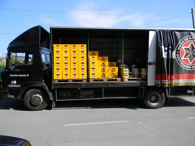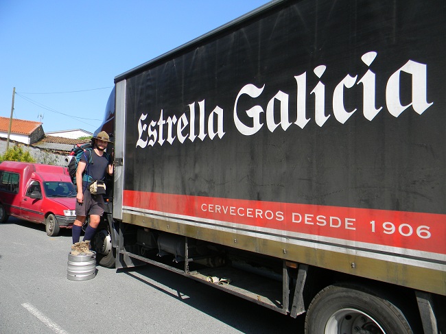 Subito dopo pranzo, scendendo verso il centro abitato di Palas de Rei, incrocio un camion che mi passa davanti: è un camion di Estrella Galicia! L’occasione è troppo ghiotta per non essere presa al volo: fermo l’autista e ne approfitto per farmi scattare una foto che ritengo preziosissima.